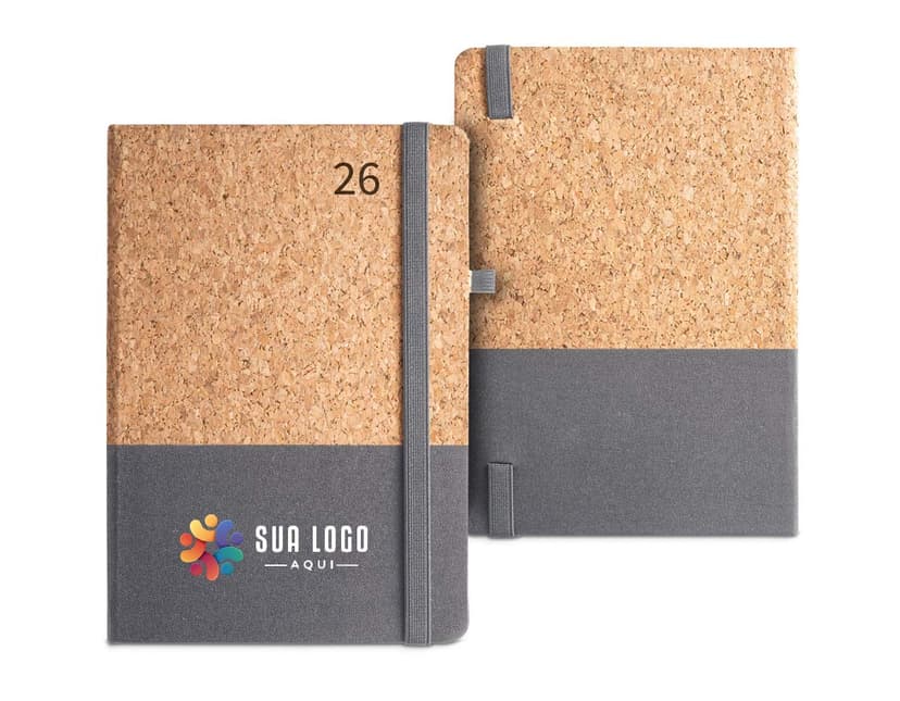 COD.: 4874Agenda 2026 com capa em cromato e encadernação em Wire-O metálico. Conta com páginas dedicadas para dados pessoais, calendários de 2025 a 2027, orçamento pessoal, planejamento mensal, espaço para anotações diárias e lista de contatos e aniversários.