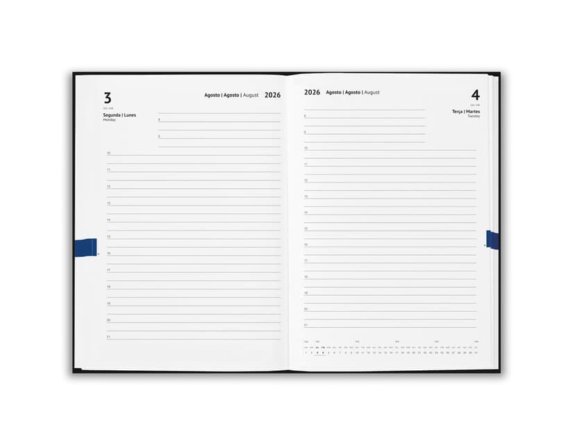 COD.: 4875Agenda 2026 com capa emborrachada e encadernação em Wire-O metálico. Conta com páginas dedicadas para dados pessoais, calendários de 2025 a 2027, orçamento pessoal, planejamento mensal, espaço para anotações diárias e lista de contatos e aniversários.
