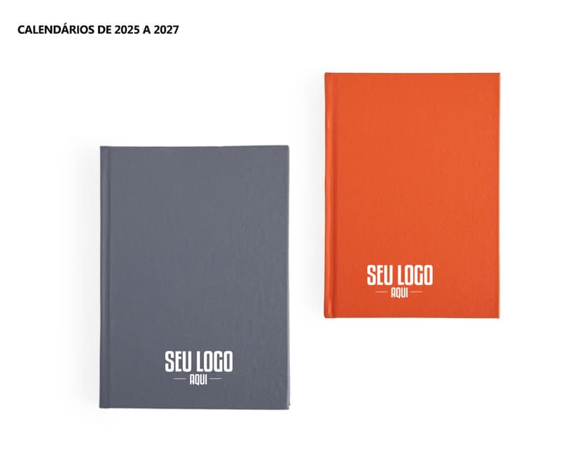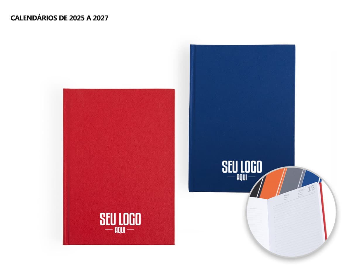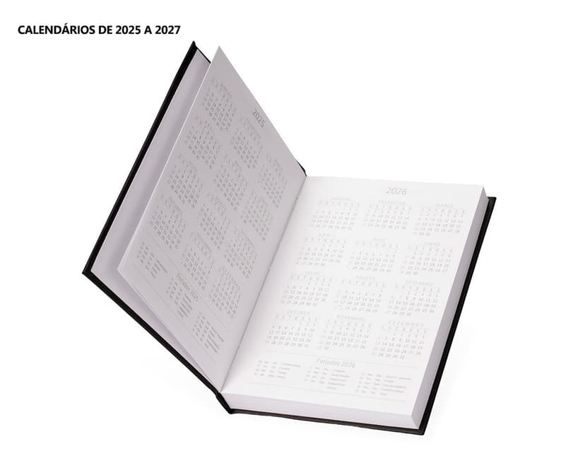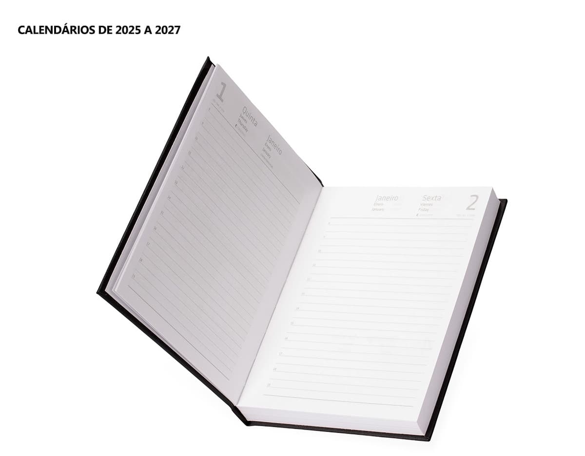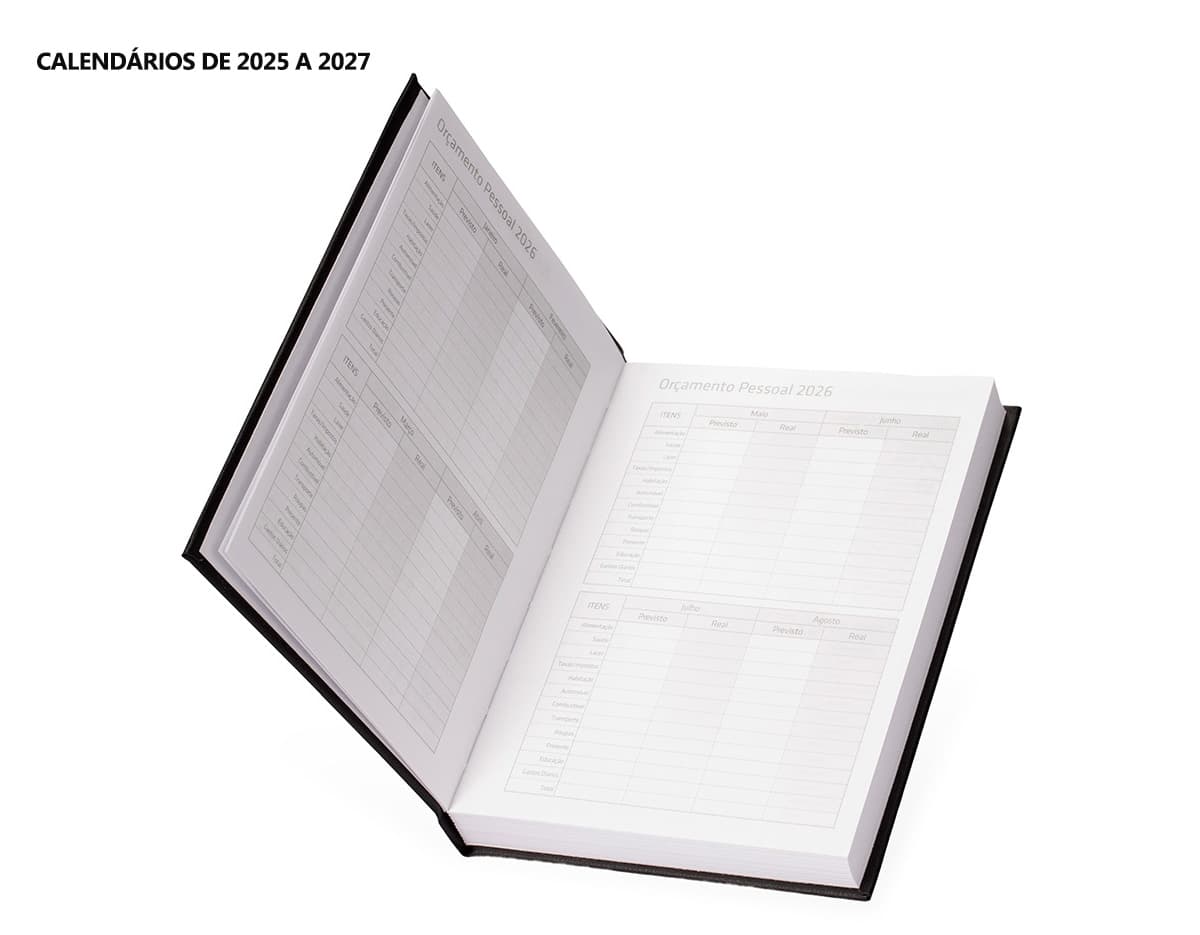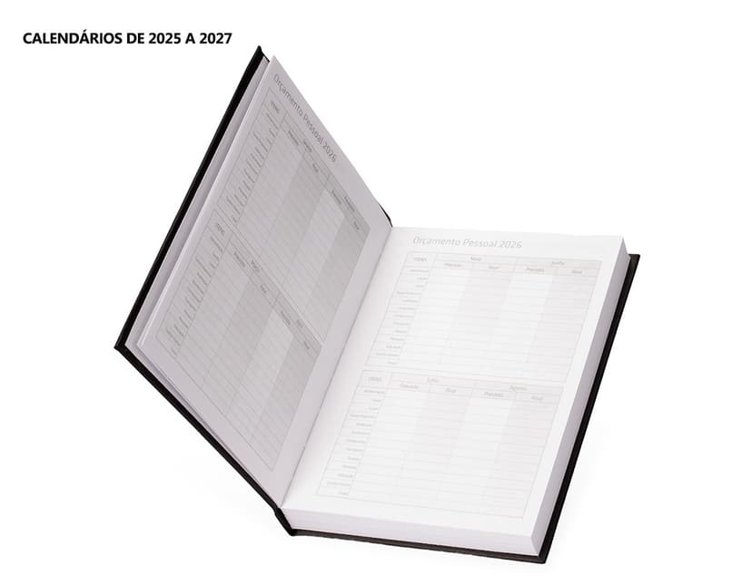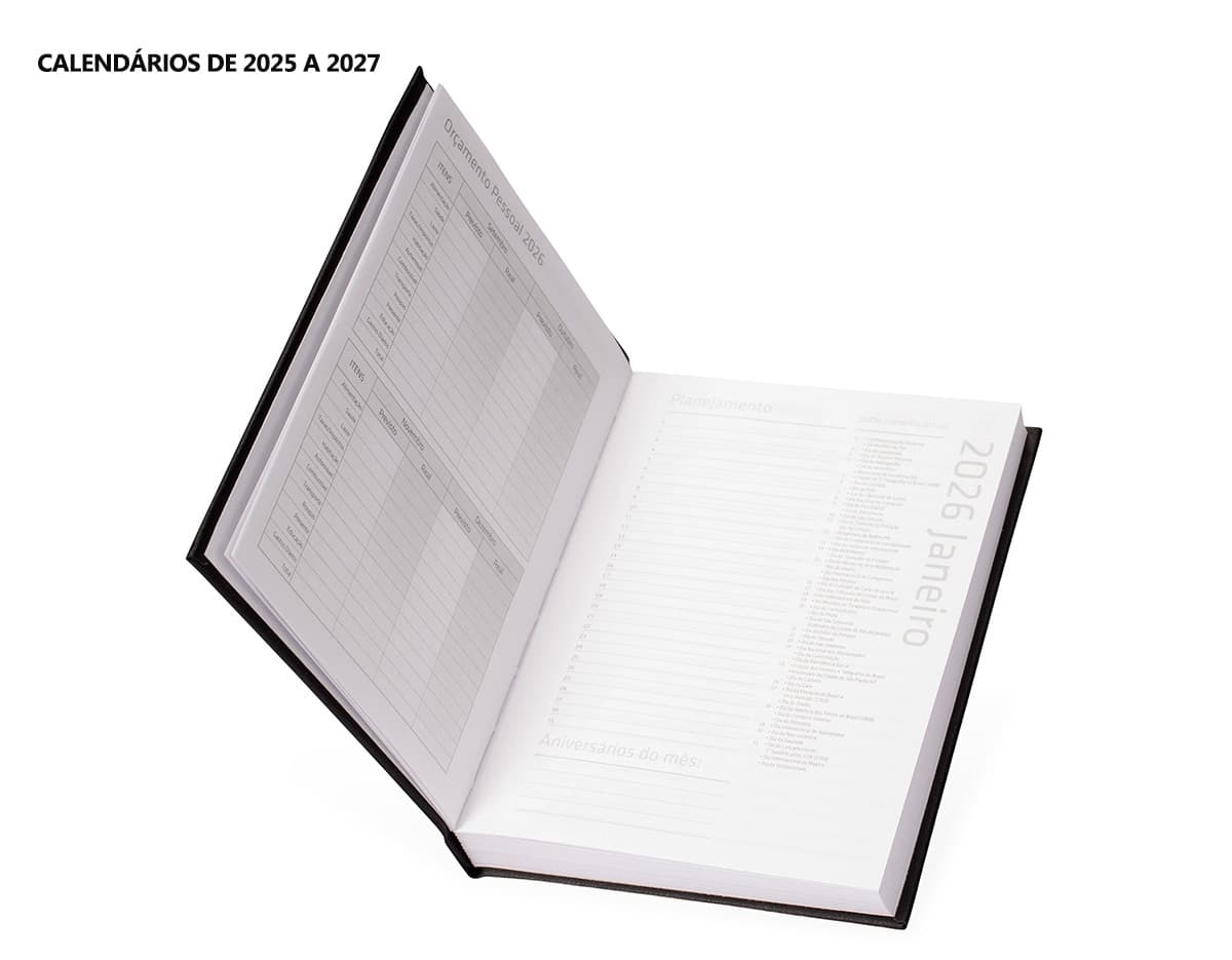 COD.: 4876Agenda modelo 2025 com capa dura em cromato e encadernação em Wire-O. Contém páginas dedicadas a dados pessoais, calendários de 2025 até 2027, orçamentos mensais, anotações, planejamentos mensais, lista de contatos e mapas.