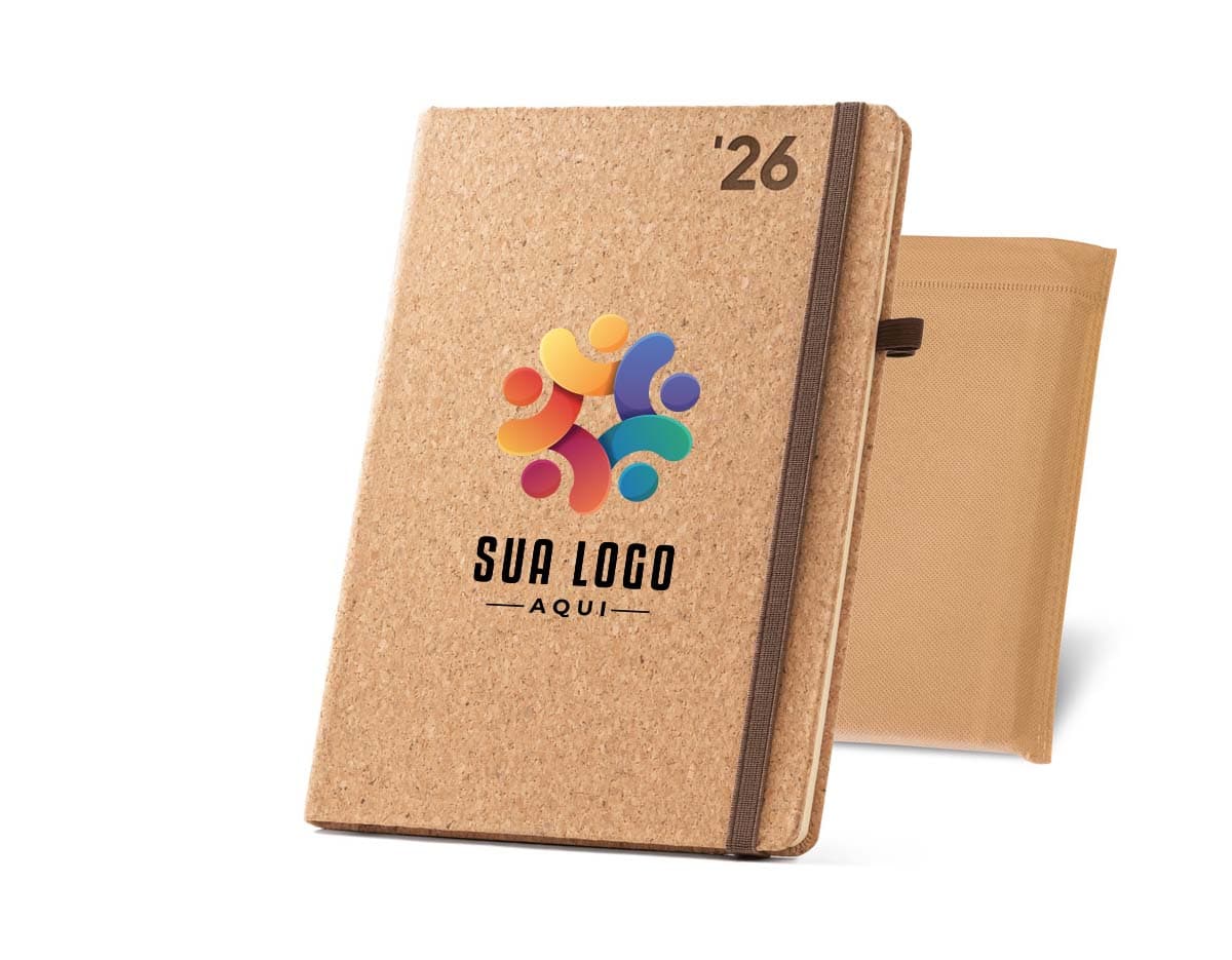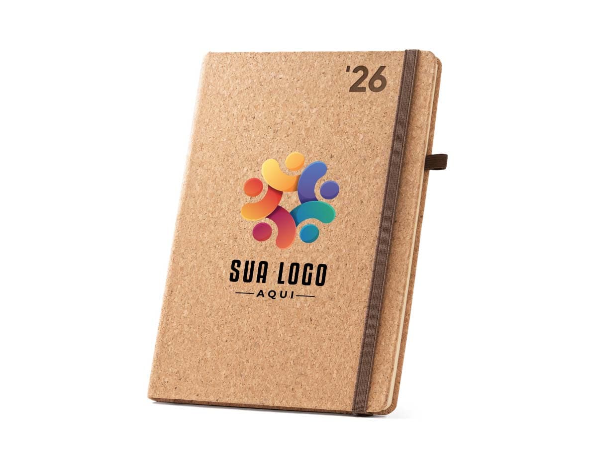 COD.: 4102Agenda A5 em cortiça. Possui um suporte para esferográfica (não inclusa), miolo em cor marfim e marcador em fita. Está organizada num plano diário.