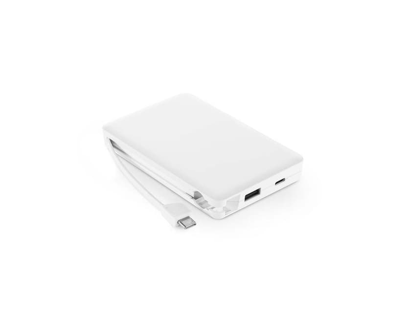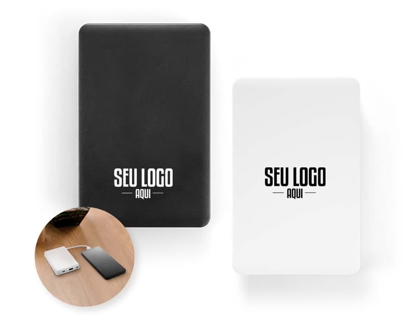 Bateria portátil com capacidade de 10.000 mAh, fabricada em ABS 100% reciclado. Possui indicador de carga, porta USB-C (entrada/saída), porta USB-A e cabo USB-C integrado de entrada e saída. Permite carregar até dois dispositivos ao mesmo tempo, oferecendo praticidade no uso diário.
