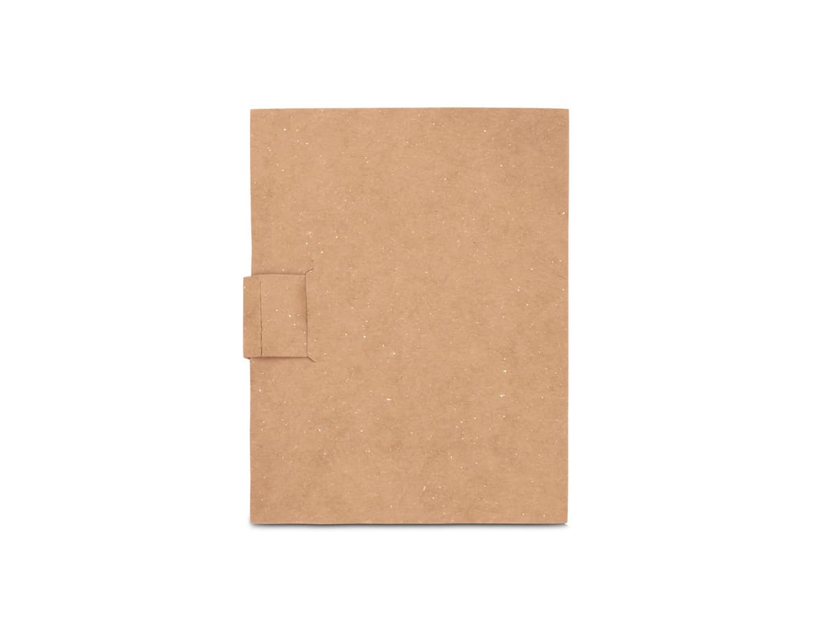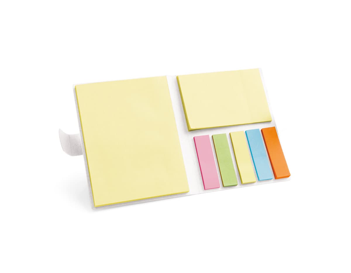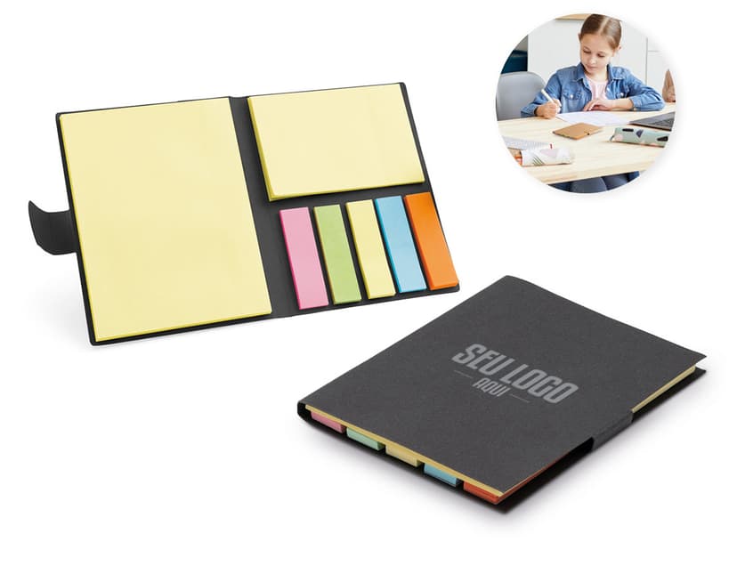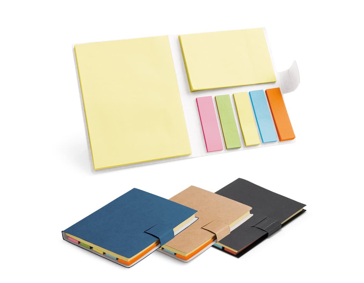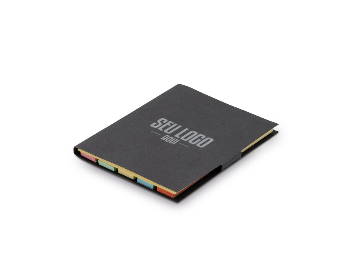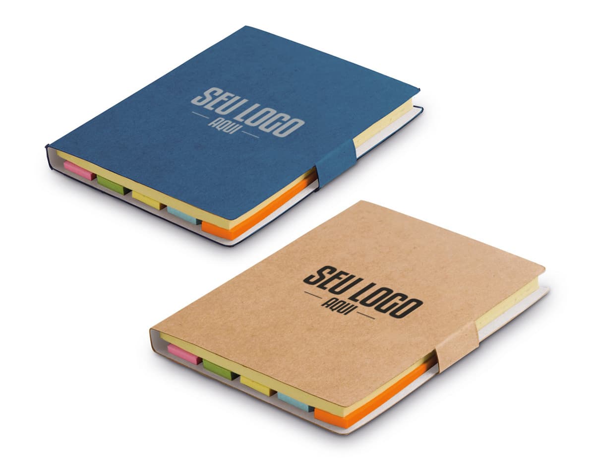 Bloco adesivado, com 7 blocos de 25 folhas cada, capa em cartão resistente e design funcional. Produzido com material de origem sustentável, é uma escolha prática e consciente para ações promocionais e brindes corporativos que valorizam responsabilidade ambiental.