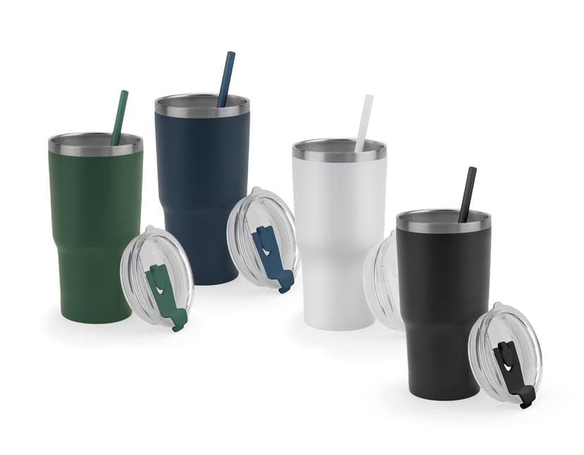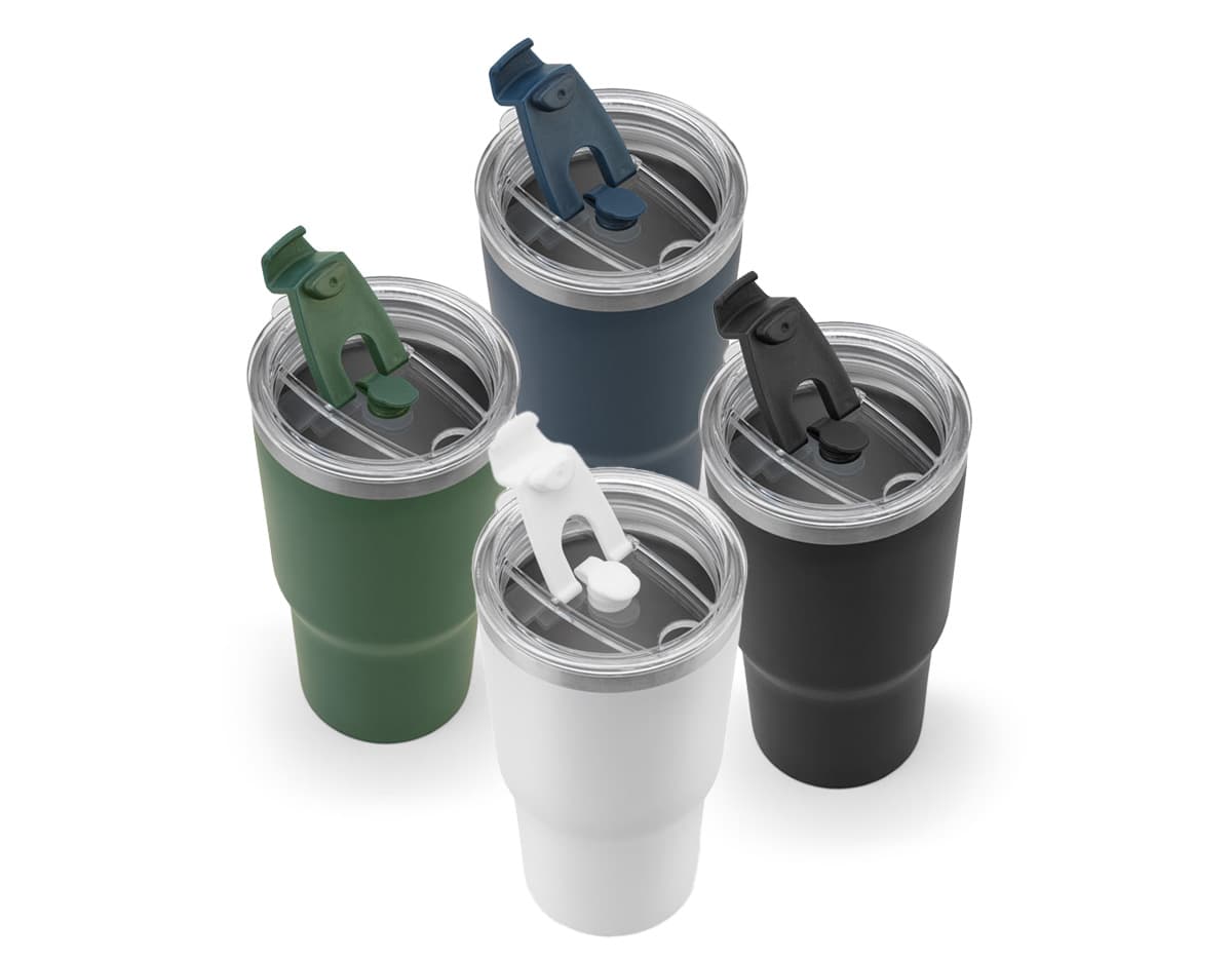 Copo de viagem em aço inox 91% reciclado, com parede dupla isolada a vácuo e acabamento fosco. Possui tampa com duas opções de uso: abertura para palhinha ou orifício para beber diretamente, ambos com fechamento. Design compacto e funcional para uso em viagens ou atividades ao ar livre. Capacidade até 600 ml.