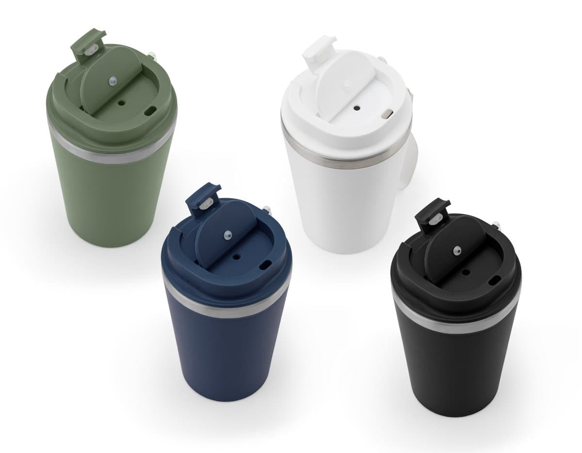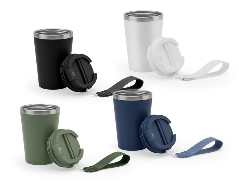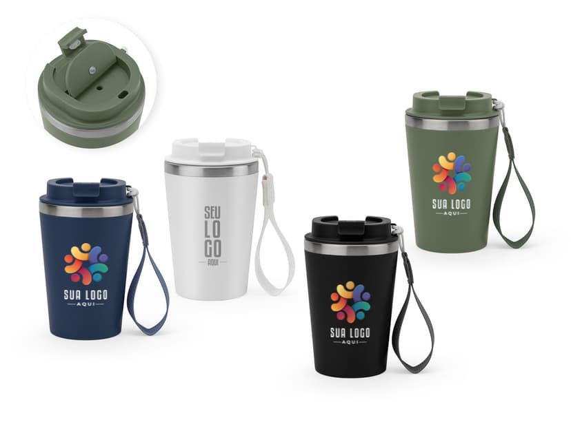 Copo de viagem com capacidade de até 460 mL, confeccionado em polipropileno (PP) e aço inox 90% reciclado. Apresenta parede dupla com acabamento fosco, ideal para manter a temperatura da bebida por mais tempo. A tampa em PP é à prova de vazamentos e possui uma alça em PU e PET que facilita o transporte com segurança e praticidade.