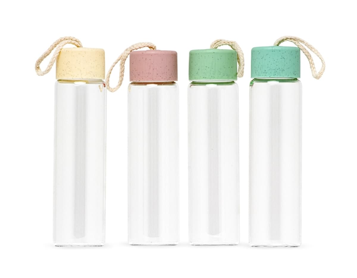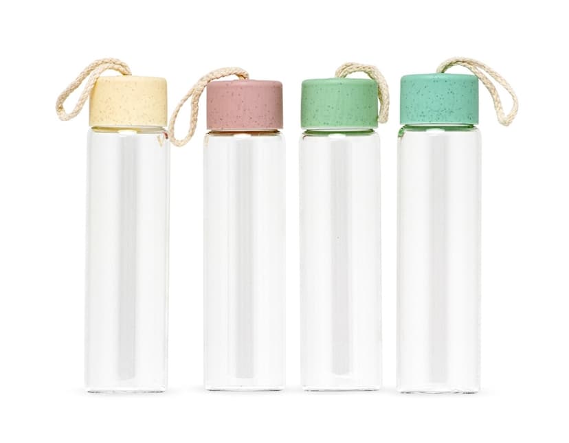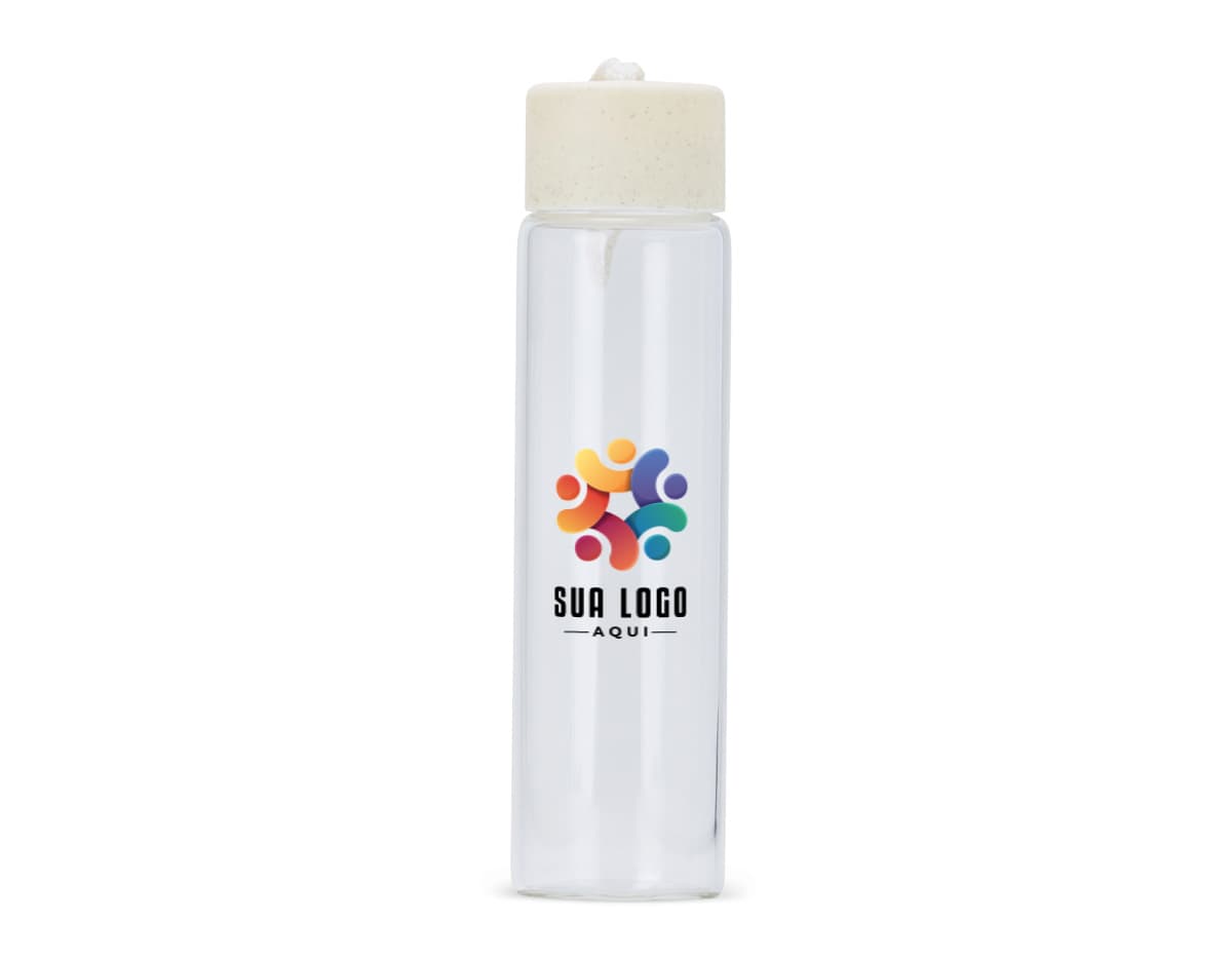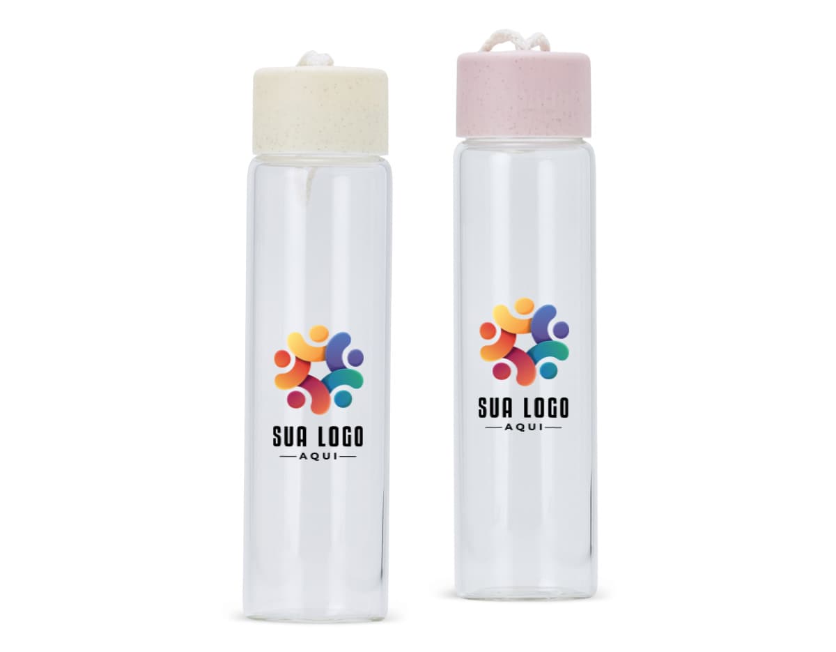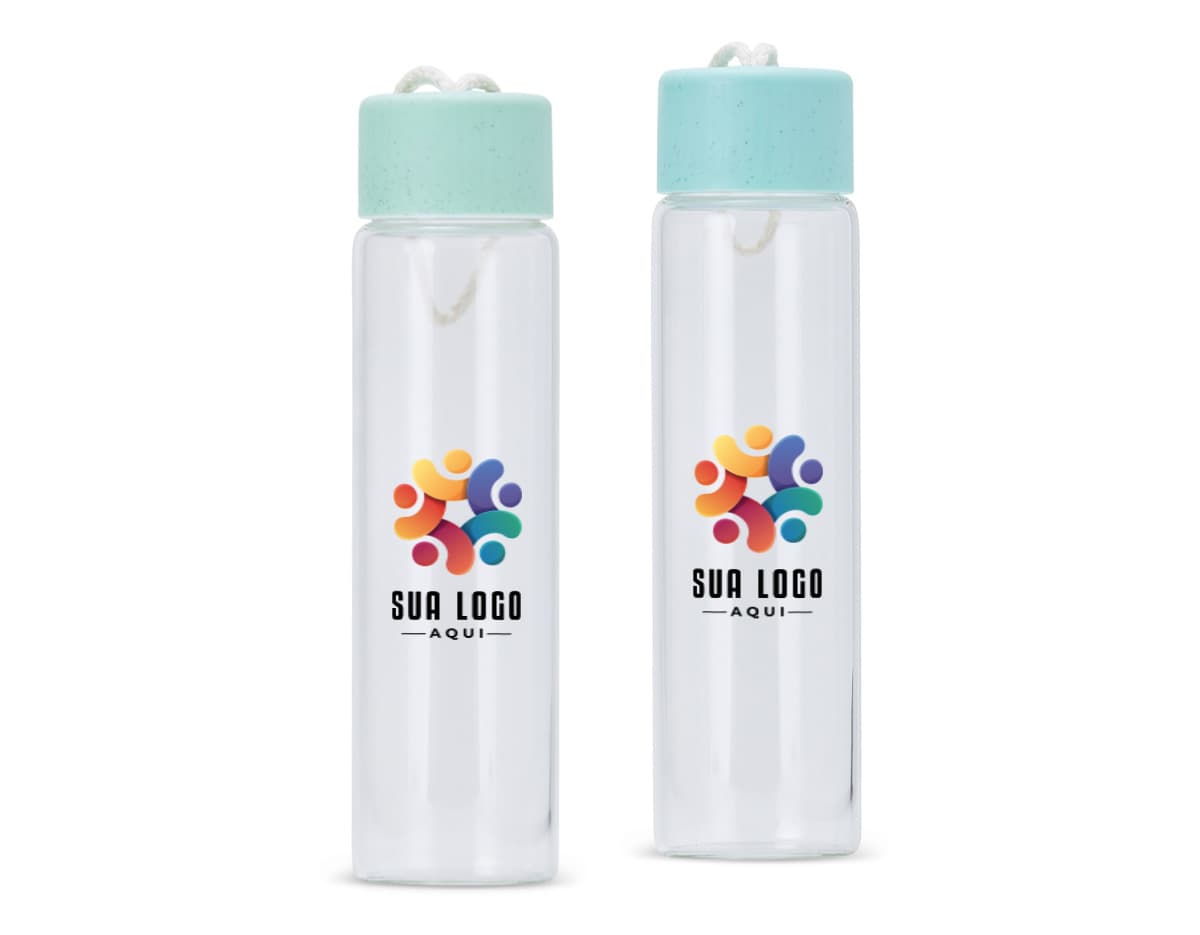 Garrafa de vidro 330ml, ideal para brindes sustentáveis. Conta com tampa plástica de rosca que evita vazamentos e alça em algodão para facilitar o transporte. Compacta, reutilizável e perfeita para ações promocionais que valorizam o cuidado com o meio ambiente e o uso no dia a dia.