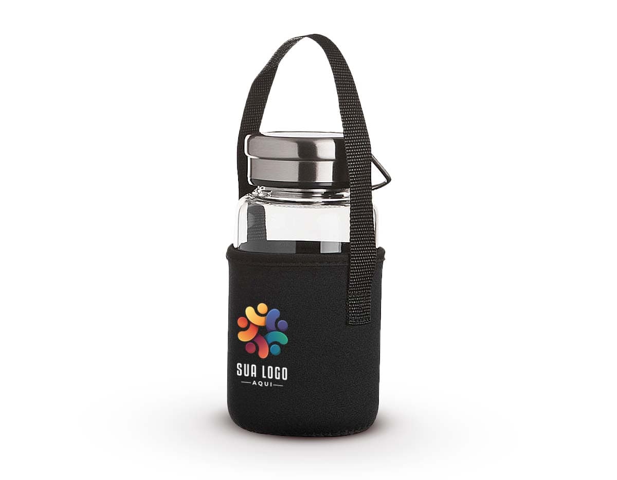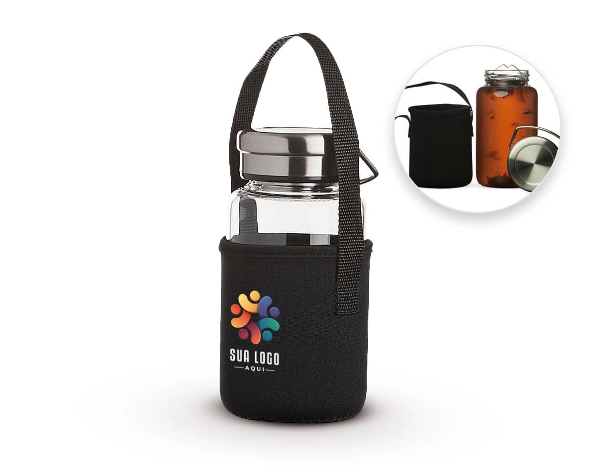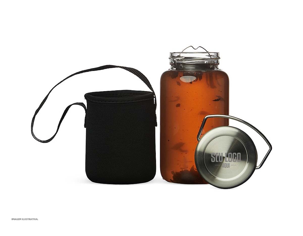 Garrafa de vidro borossilicato com capacidade de 650ml, acompanha peneira infusora e capa de neoprene com alça para transporte. Tampa de alumínio com alça para transporte.