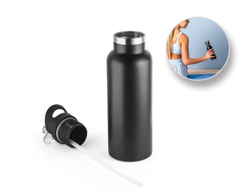 COD.: 4711Garrafa térmica em aço inox com parede dupla com capacidade de até 570 ml. Tampa rosqueável, mosquetão em plástico e anel de silicone para vedação. Design com frisos na tampa e pintura pó.