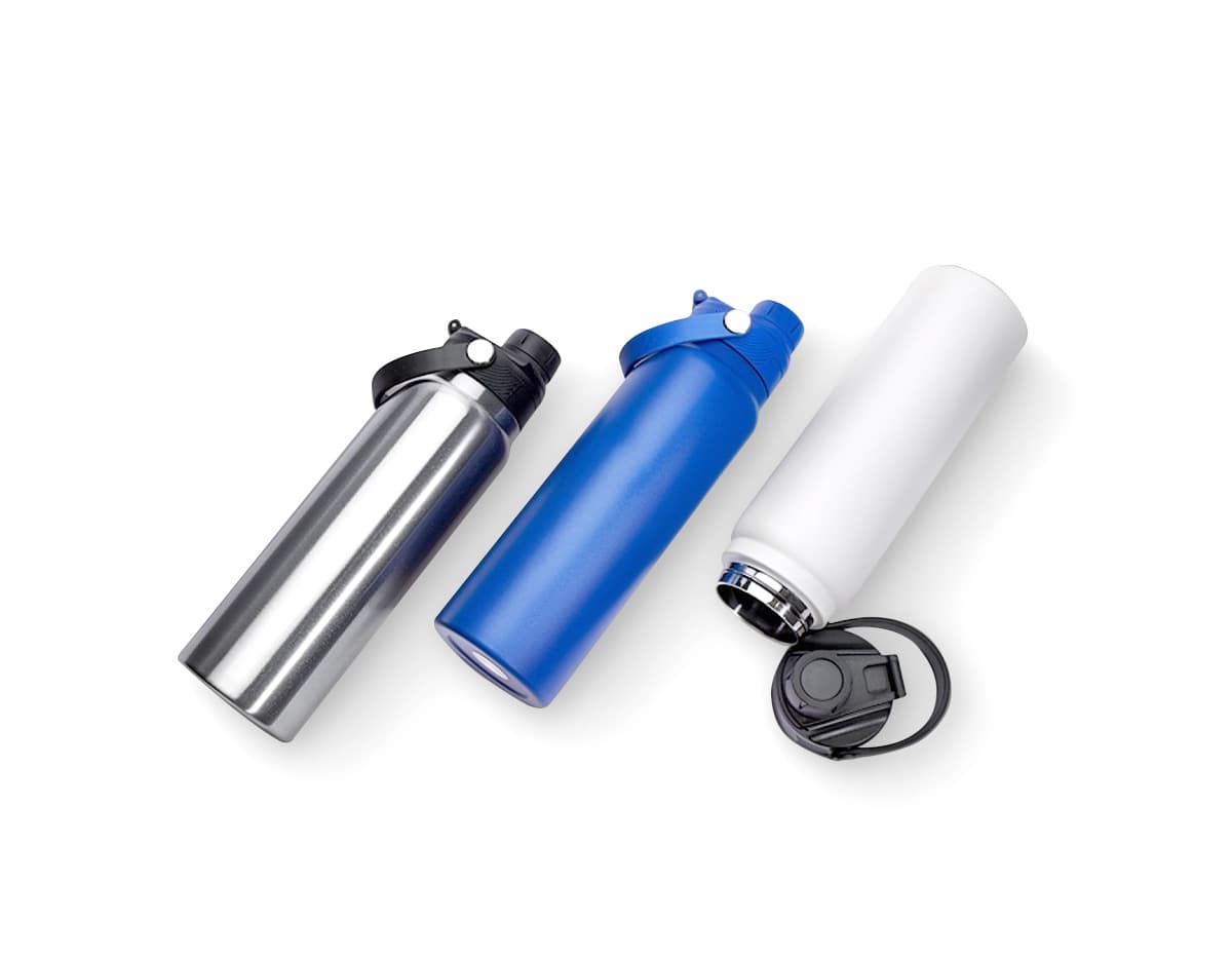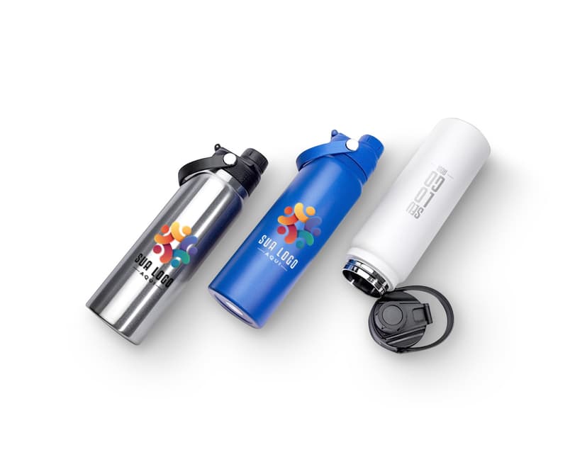 Garrafa em aço inox com parede dupla isolada a vácuo. Capacidade até 1L.