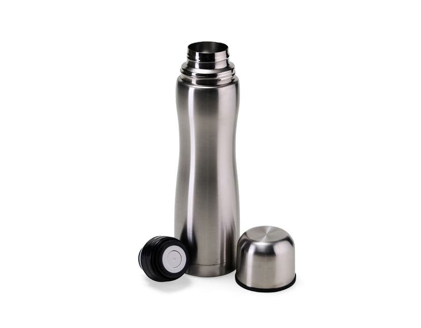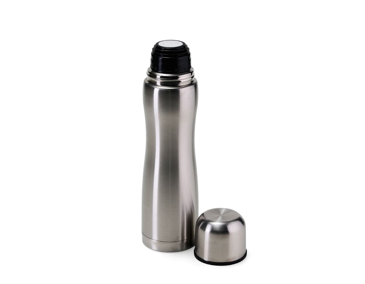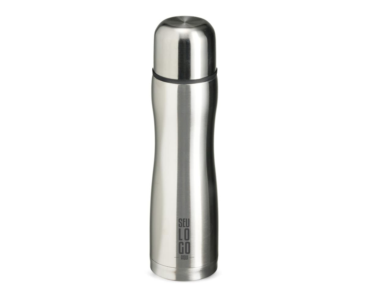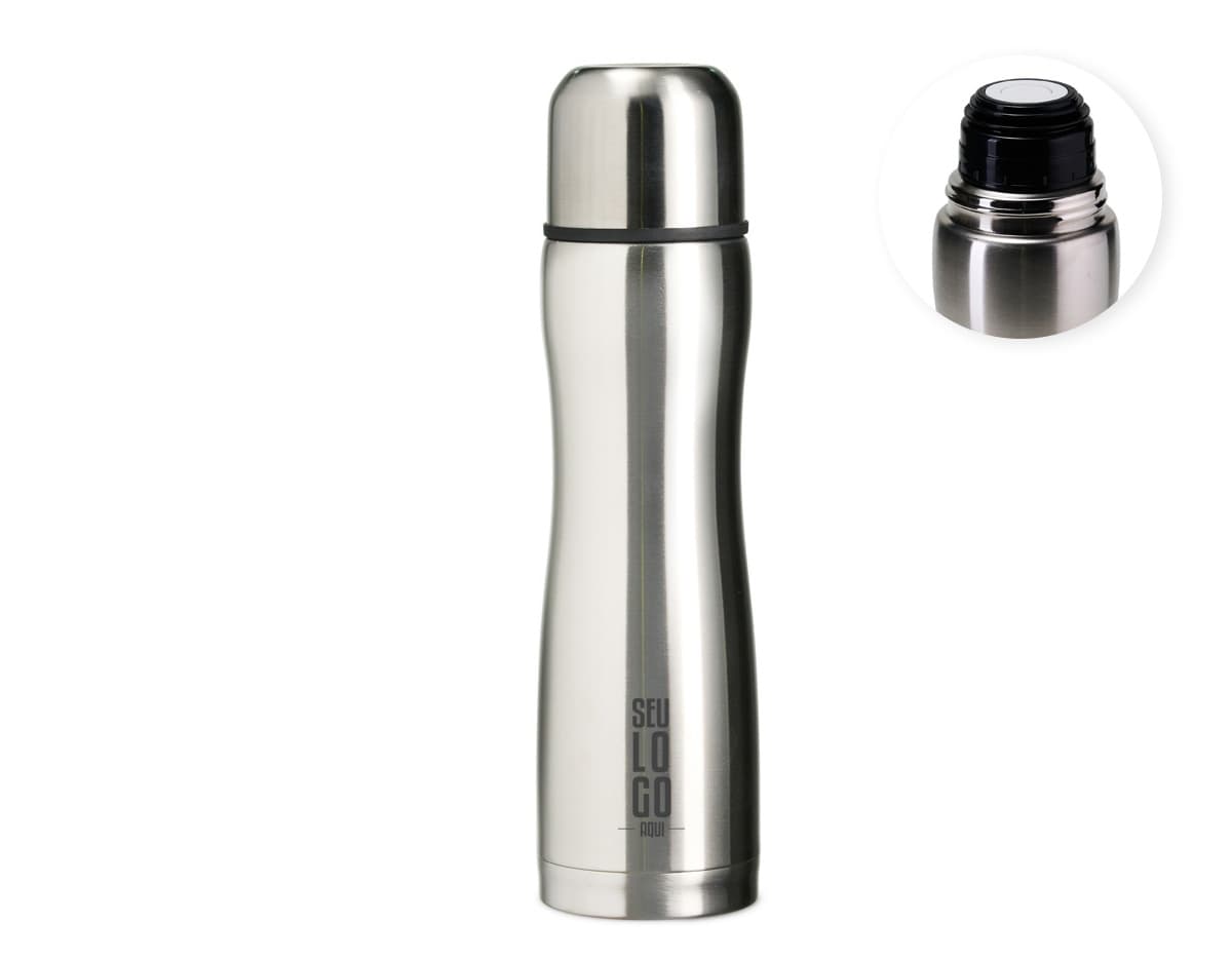 Garrafa em aço inox com parede dupla isolada a vácuo. Capacidade até 750 ml. Inclui 2 copos. Food grade. Fornecida em caixa
