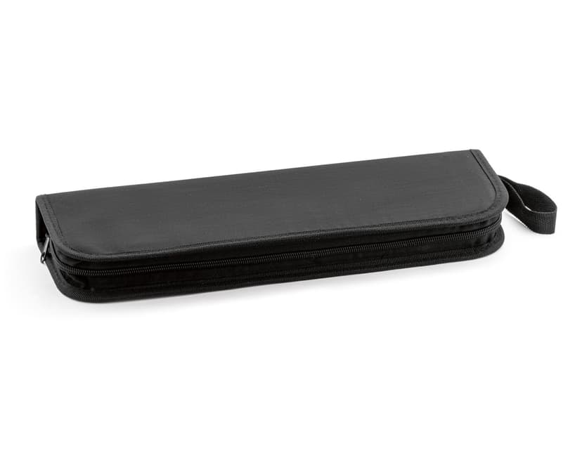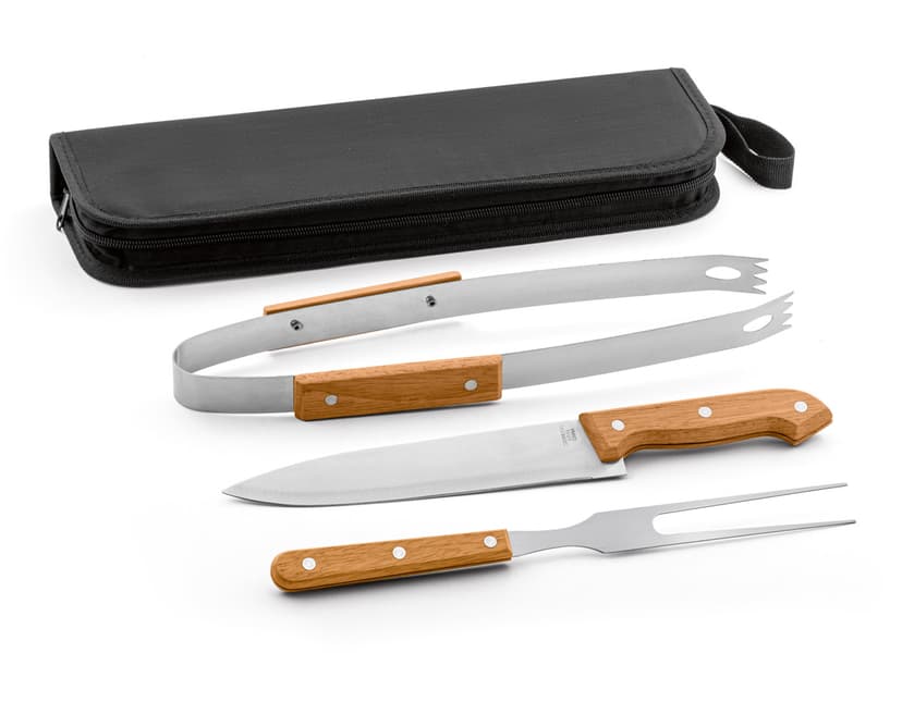 Kit churrasco em aço inox e madeira. Possui estojo de nylon de 210D e 3 peças.