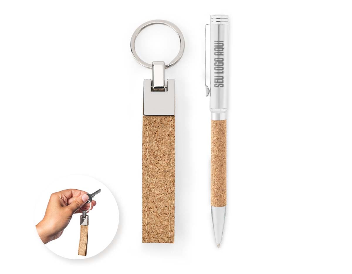Conjunto elegante composto por uma caneta esferográfica e um chaveiro, ambos confeccionados em metal e cortiça, combinando sofisticação e sustentabilidade. A caneta possui mecanismo twist, clipe metálico e carga azul. Acompanha caixa para presente em papel kraft reciclado. Por se tratar de materiais naturais, a cor e a impressão podem variar de peça para peça.