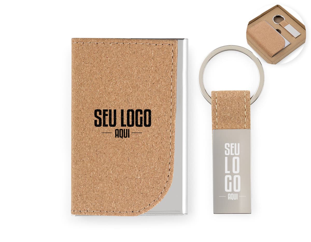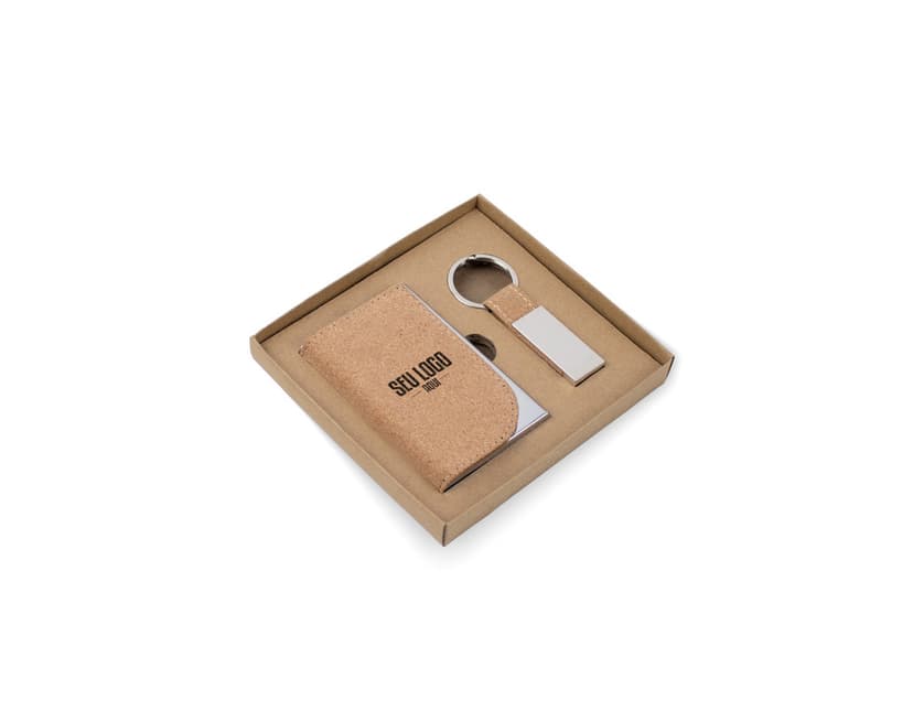 Conjunto composto por porta-cartões e chaveiro, ambos fabricados em metal e cortiça, unindo durabilidade e estilo sustentável. O porta-cartões possui capacidade para até 7 cartões, ideal para organização prática no dia a dia.