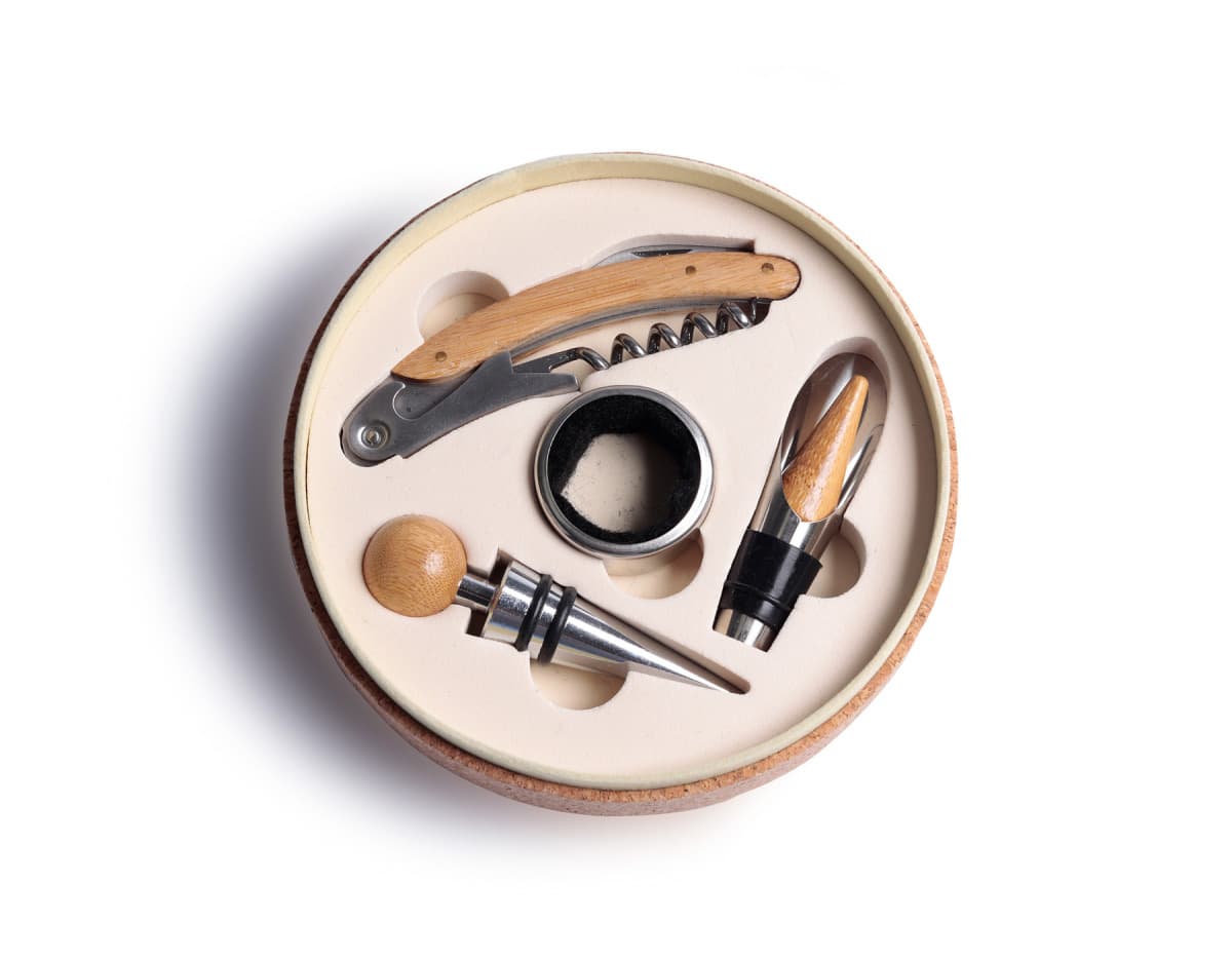 COD.: 3568Kit Vinho 5 peças, contendo: Estojo redondo de cortiça com base emborrachada bege claro; Saca Rolha de metal com detalhes em bambu; Corta gotas de metal; Bico para servir de metal com tampa acoplada em bambu; Tampa de metal com detalhe em bambu.