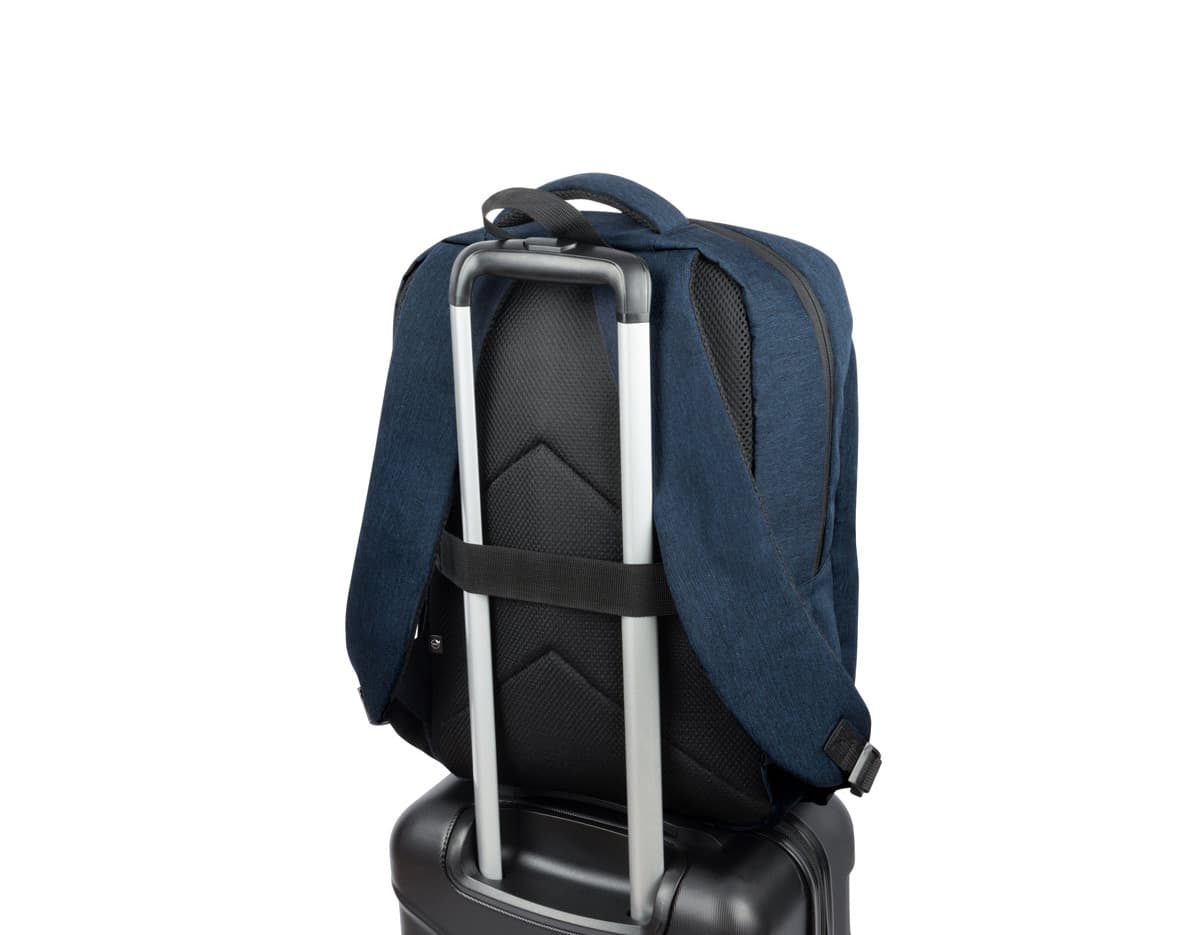COD.: 7310Mochila antirroubo em poliéster reciclado 600D com detalhes em PU e interior em poliéster reciclado 210D. Resistente à água, conta com compartimento principal com bolsos almofadados para notebook até 17.3" e tablet até 10.5", além de compartimentos laterais e frontais. Parte traseira acolchoada, pega superior e alça para trolley. Capacidade até 20 L.