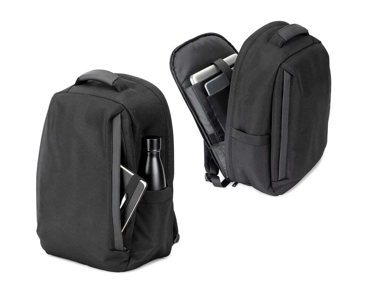 COD.: 2386Mochila para notebook. 600D de alta densidade. Compartimento forrado, com 2 divisórias almofadadas para notebook até 14'' e tablet 9.7''. Bolso frontal e 1 bolso lateral. Parte posterior e alças almofadadas. Placa metálica removível com imã, para fácil gravação