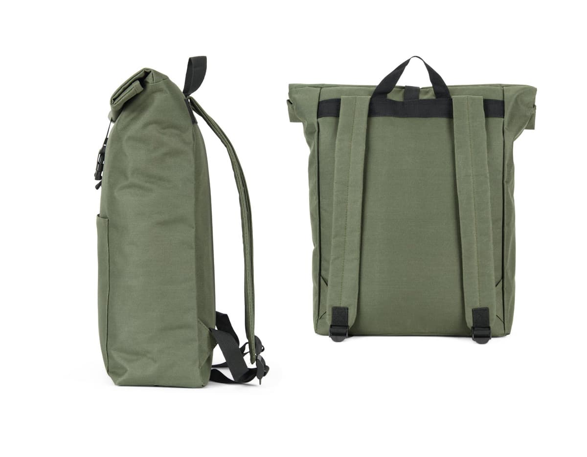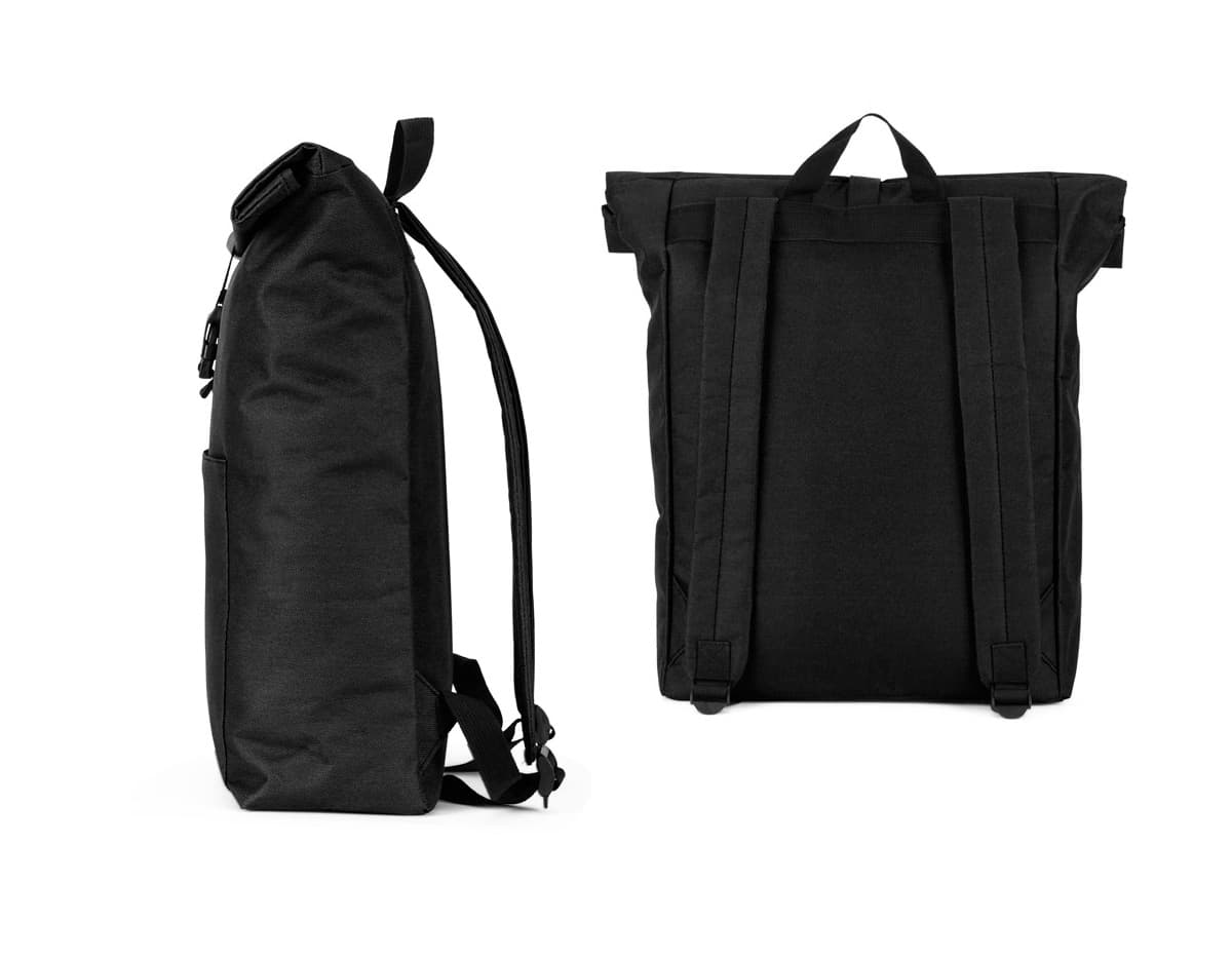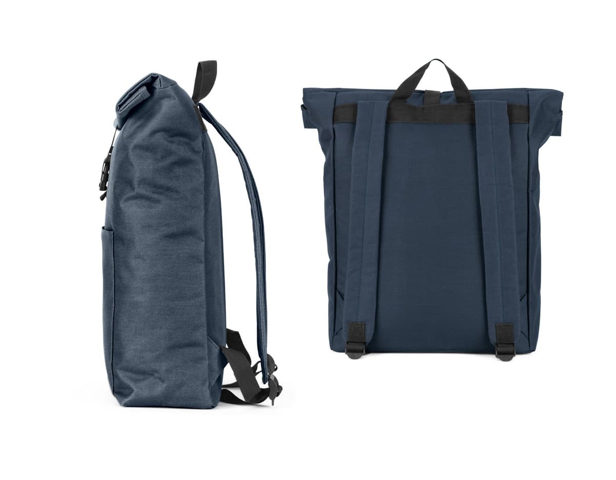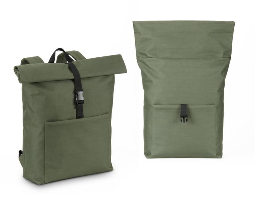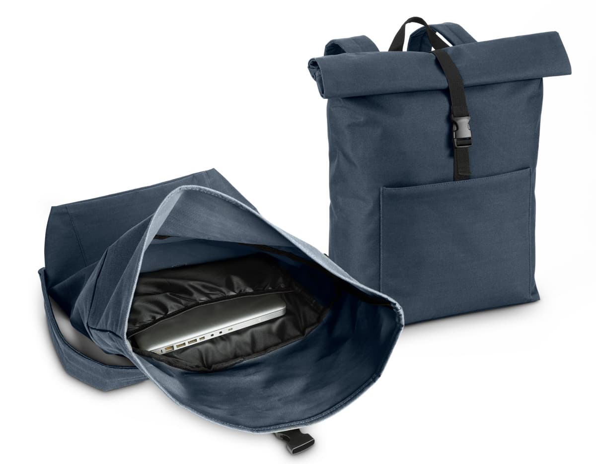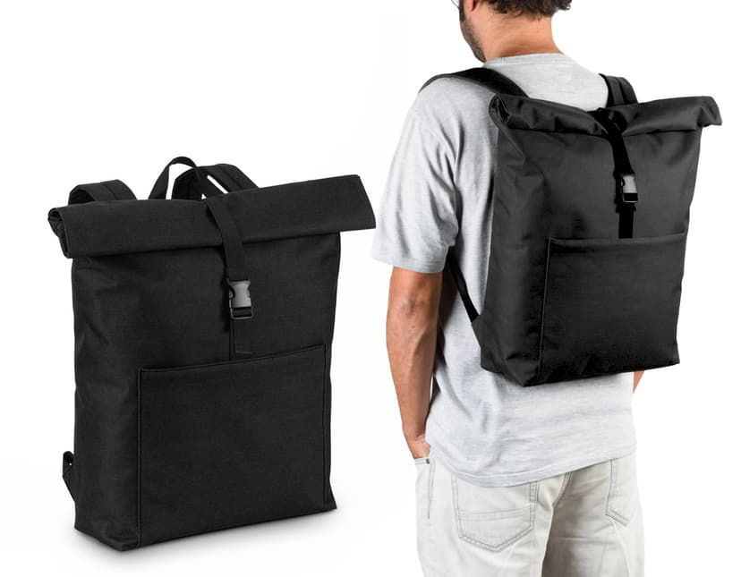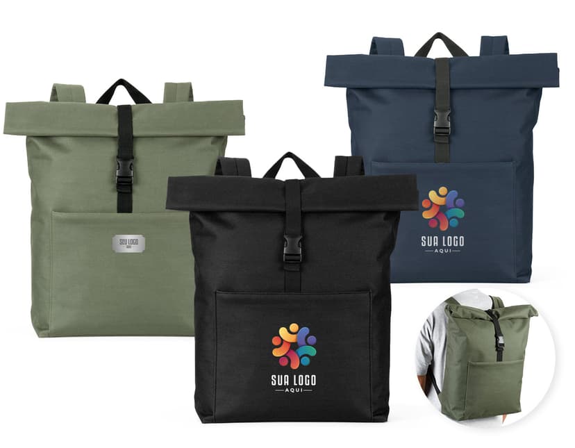 Mochila "Roll-top" para notebook em 600D e forro em 210D. Possui um compartimento principal espaçoso para notebook até 17.3", com fecho de enrolar no topo. Bolso frontal com zíper.