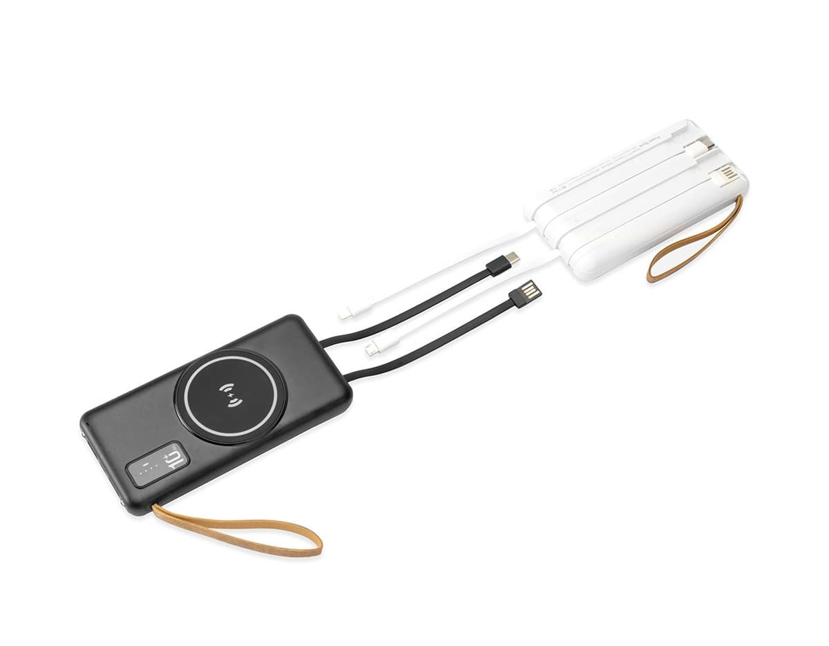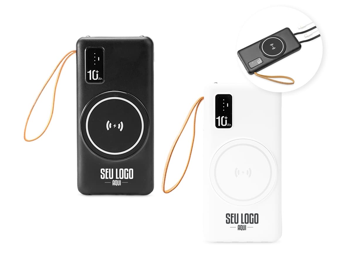 ower Bank em plástico com capacidade de 10.000mAh. Possui quatro cabos integrados com saídas para Lightning, USB-C, Micro-USB e USB, além de área de recarga por indução magnética para dispositivos compatíveis e lanterna de LED. Conta ainda com entradas USB-A e USB-C para recarga do próprio aparelho e alça de tecido sintético para transporte.
