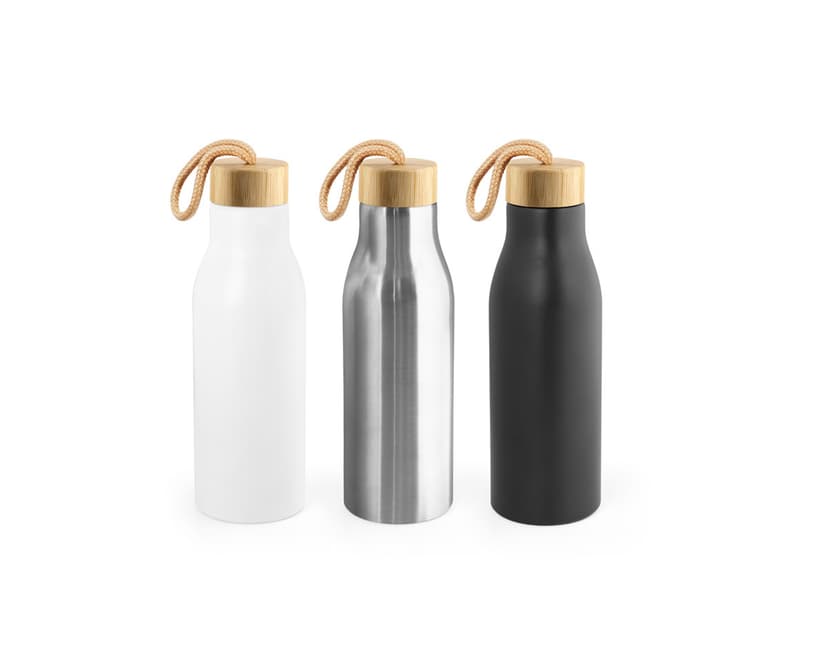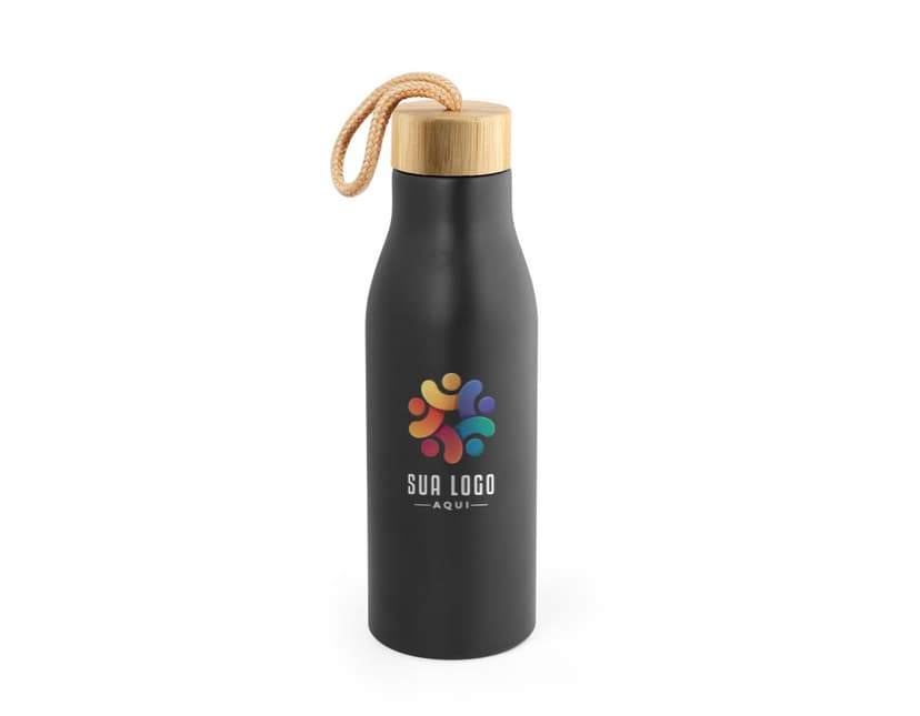 Squeeze em aço inox 90% reciclado, com parede simples e acabamento fosco. A tampa em bambu possui alça integrada para facilitar o transporte. Capacidade de até 570 ml, ideal para manter a hidratação com sustentabilidade e praticidade.